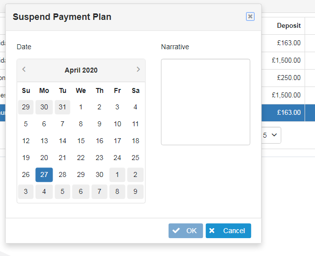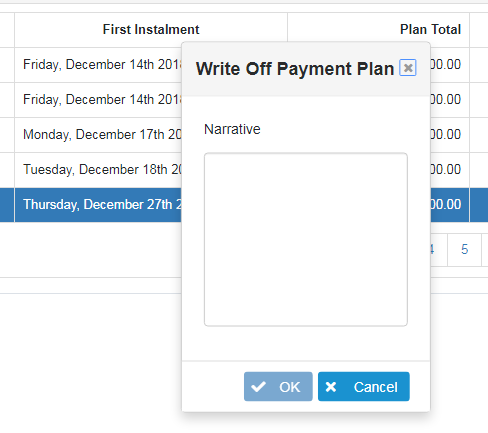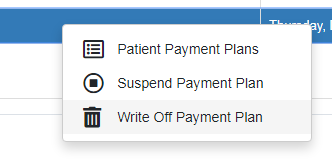 From both the payment plans report and the patient payment plan history page it now possible to suspend and write off payment plans.